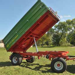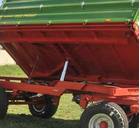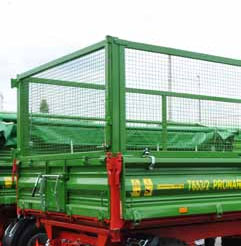 Обеспечивающие высокую герметичность прочные профили бортов высотой 500 мм, а также пол изготовлен из толстой стальной плиты (3 мм в прицепе T653 и 4 мм в остальных моделях) способствуют транспортировке сельскохозяйственных продуктов и коммунальных материалов при общей массе 4, 5, или 6 тонн. Возможность монтажа надставных бортов высотой 1 000 мм из металлической сетки позволяет перевозить товары больших размеров. Трехсторонняя разгрузка, сервисная опора кузова и клинья под колеса в стандартном оснащении обеспечивают безопасность и комфорт использования. Ссыпной люк в задним борту позволяет на дополнительный монтаж лотка или - в прицепах T653/1 и T653/2 - транспортного шнека для зерна.