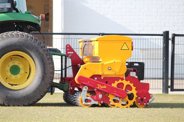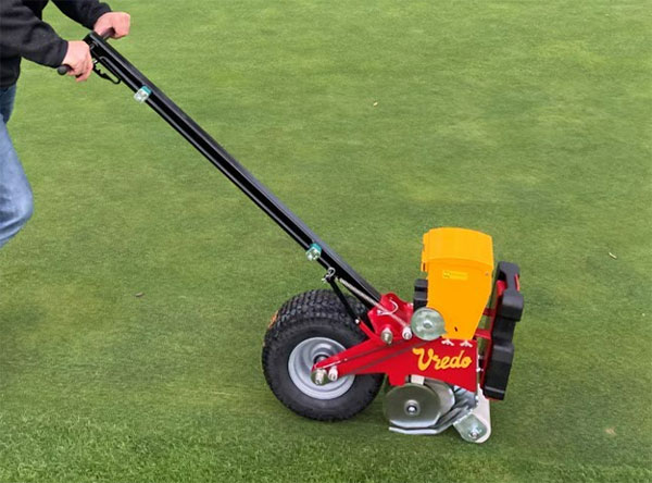 Vredo ручная газонная сеялка Терф Бадди на лужайке. Устройство очень подходит для газонов, оголенных участков на спортивных площадках и отслеживания зелени.