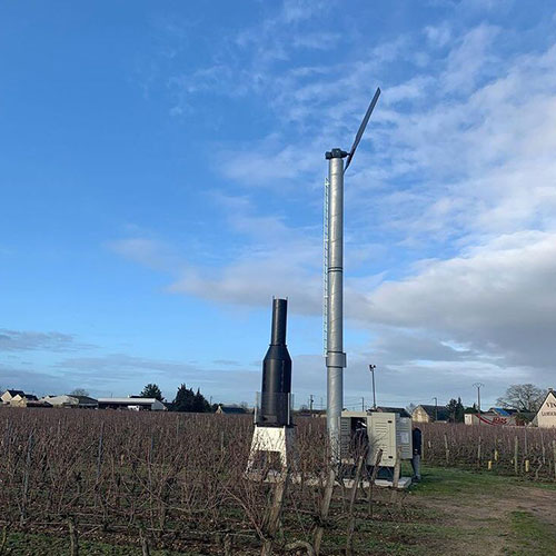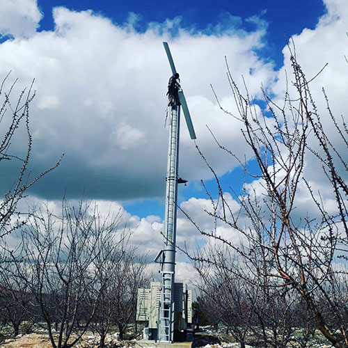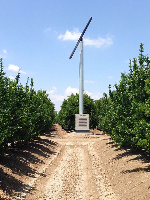 Ветрозащитные флюгеры — это надежный и эффективный метод борьбы с обратными весенними заморозками. Их задача — опускать теплые воздушные массы к поверхности земли, к кронам деревьев, и поддерживать положительную температуру как можно ближе к 0 °C . Ветрогенератор должен создавать равномерный ветер, проникающий между растениями на максимальное расстояние, чтобы обеспечить максимальную экономическую выгоду для фермеров.