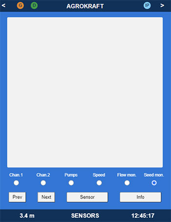 Опция Seeding monitor, позволяет подключить к системе потоковые датчики контроля высева на каждый рабочего органа и контролировать их работоспособность для каждого ряда. На экран выводится информация о текущих расходах в виде диаграммы и при отклонении происходит останов вылива с указанием проблемного рабочего органа. Диапазон отклонений для срабатывания ошибки задается в настройках. Всего доступно до 96 каналов мониторинга жидких удобрений и до 96 каналов контроля высева.